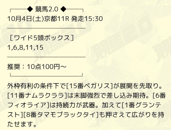 100点 | ★5 | 10戦10勝0敗 的中率:100% 回収率:424% |